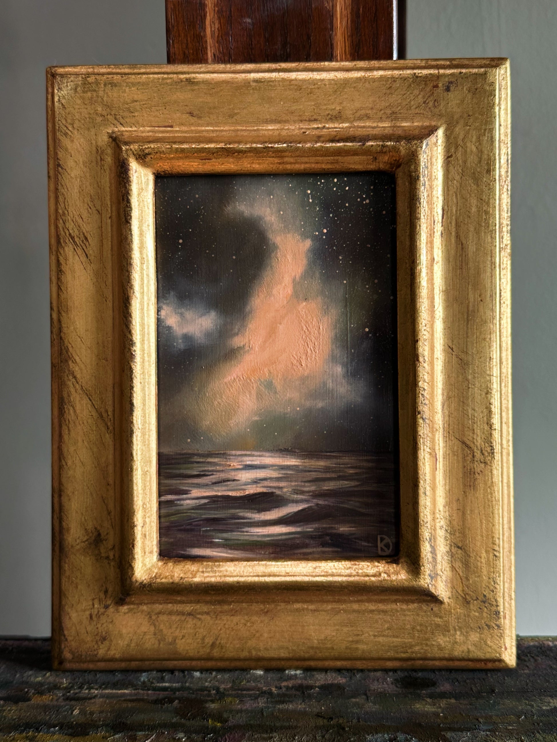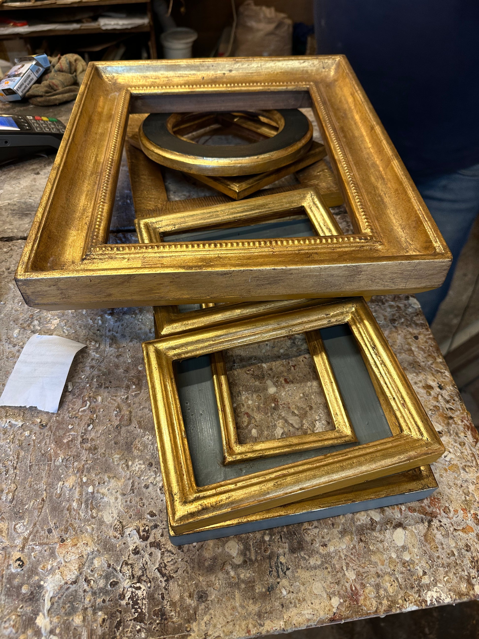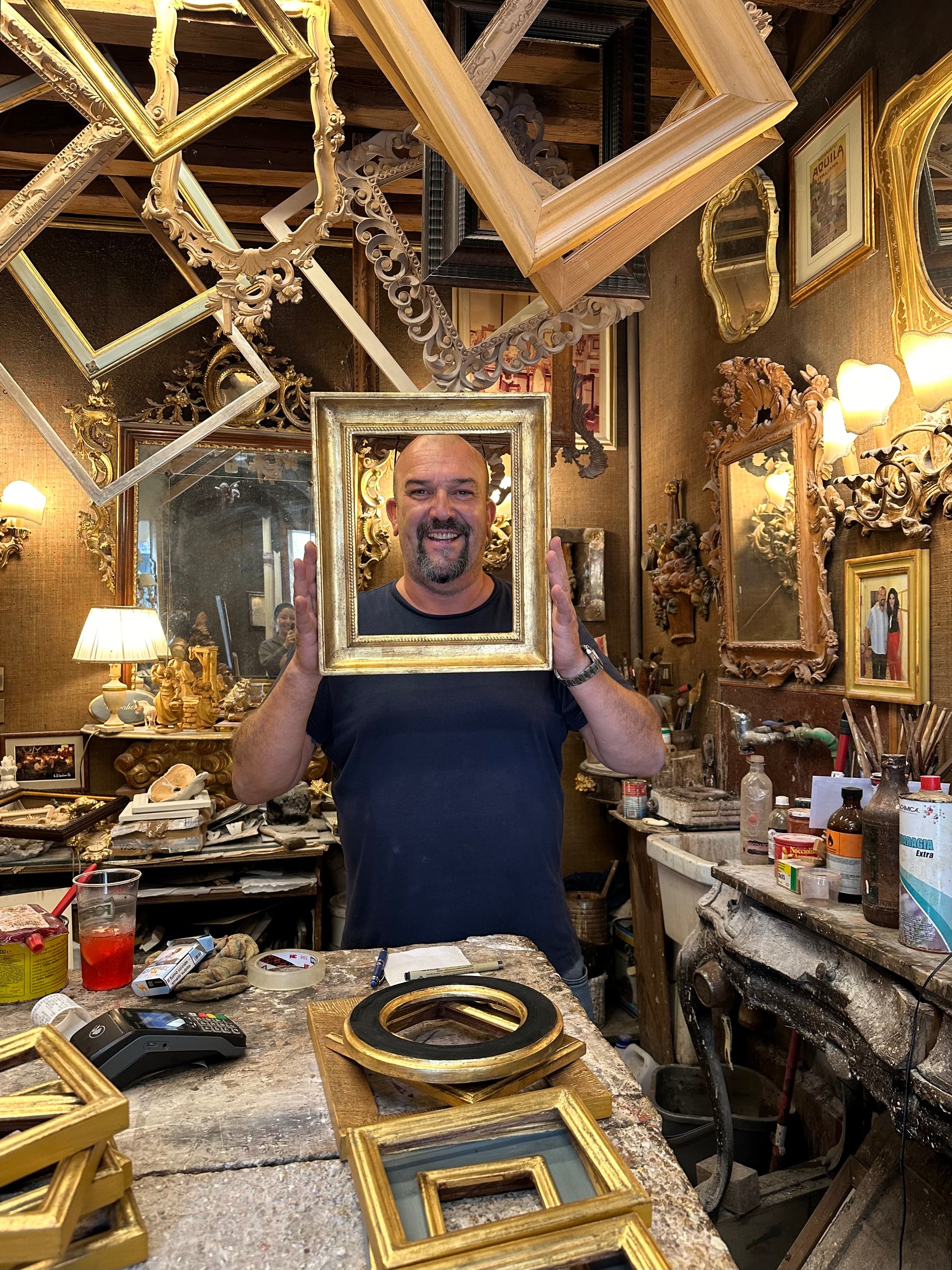 In September, I was fortunate to visit Italy to teach oil painting. I stayed in Venice and fell in love with that gorgeous place. More so, I fell in love with the many generational artisans and crafters. I stumbled into a tiny little frame shop and quickly made friends with the kind owner and maker, Alberto. He has made frames his whole life, and took over the family business from his father, who had taken it over from his grandfather. While Alberto was low in stock, he graciously allowed me to pick out a stack of unfinished frames so that he could finish them to my specifications that would best suit my art. This experience felt so full-circle because I am Italian, and I grew up in poverty; I certainly never thought I'd get to visit the country my great-grandparents came from. To have these special frames as part of this collection of paintings just felt 'right.'